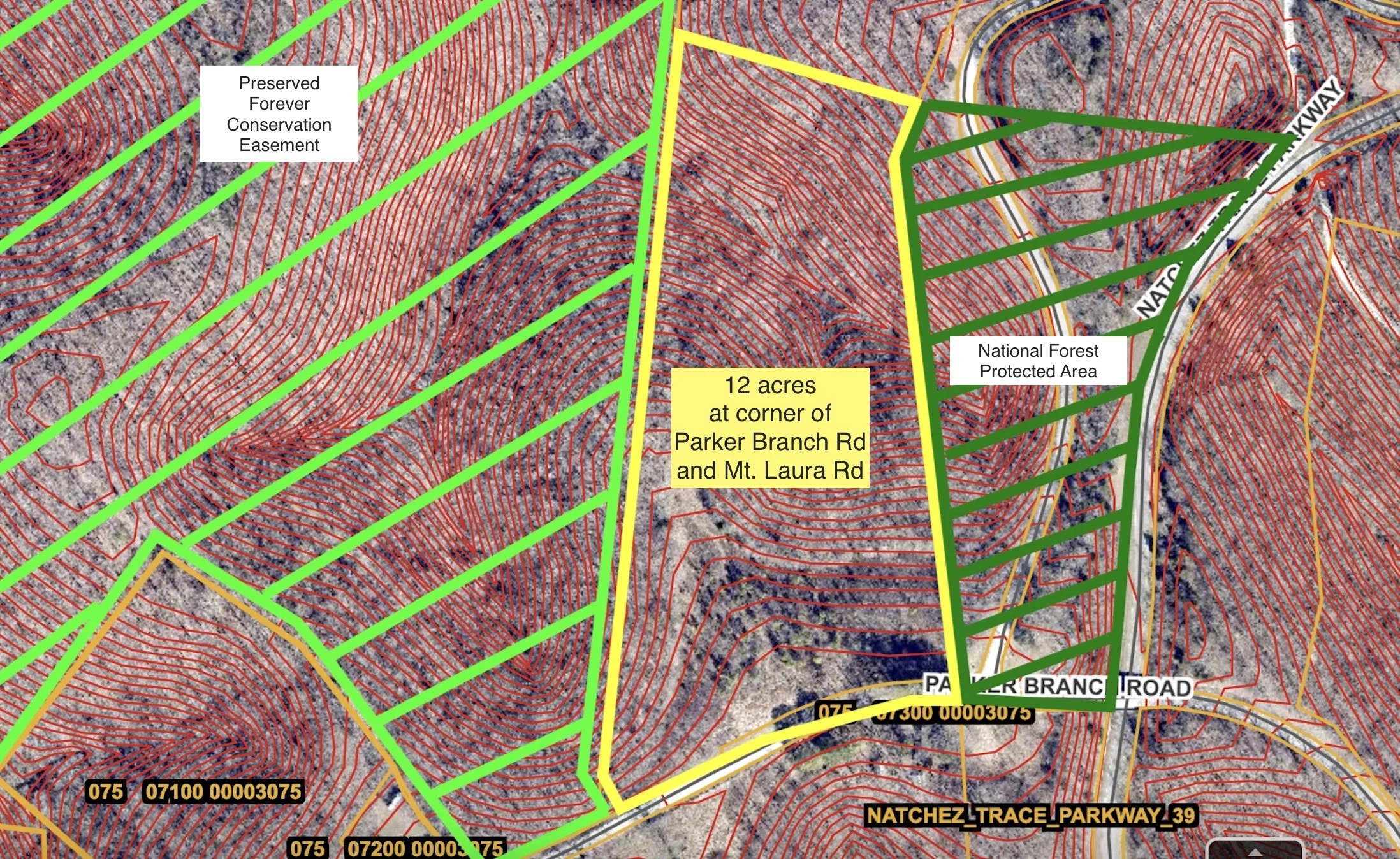 Adjacent to National Park Land (Natchez Trace) and Large Nature Conservation Easement (Center for Sustainable Stewardship)! Adjacent national forest and conservation easement buffer acres protected forever. Hatched areas below.