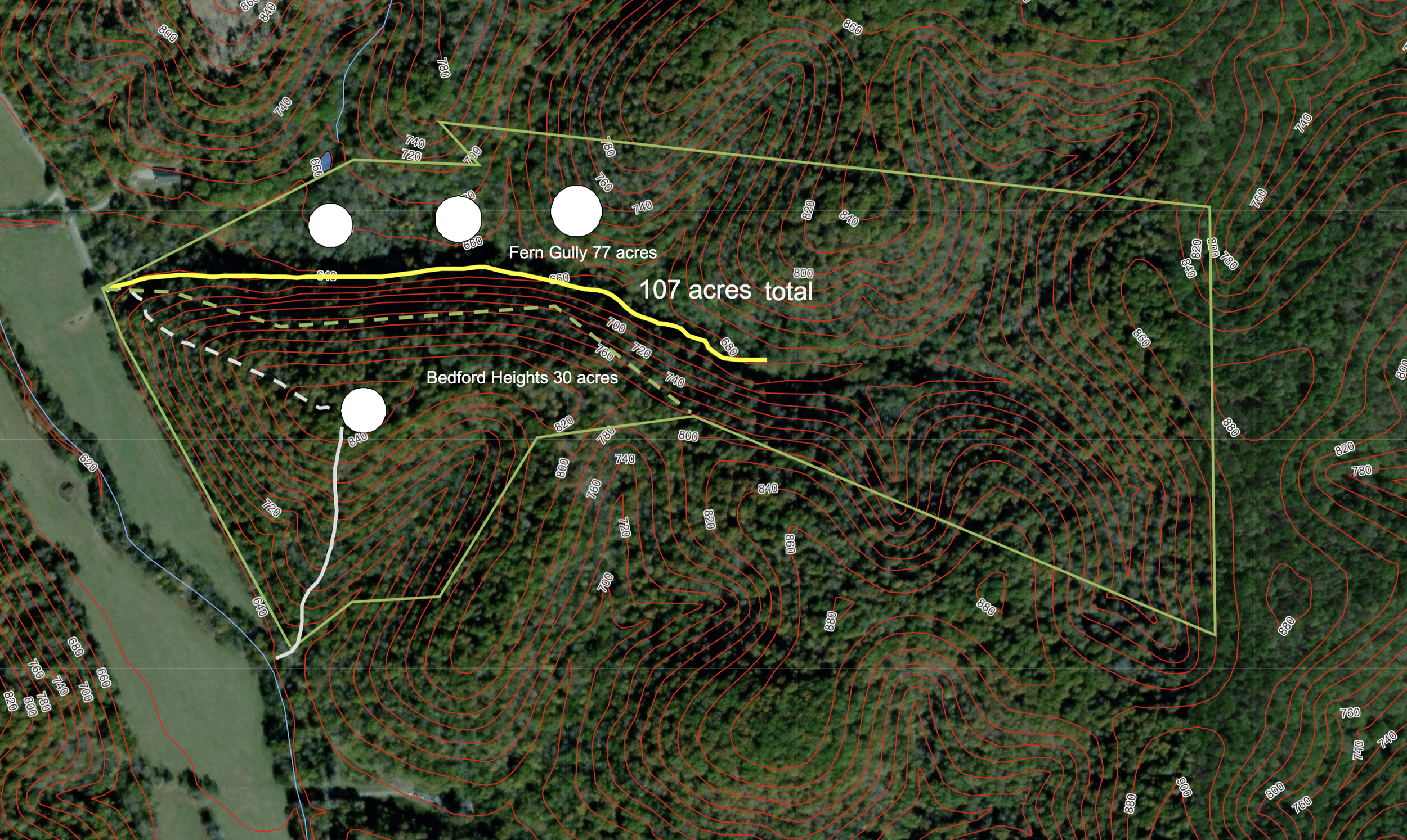 May be subdivided into 77acre lower parcel and 30 acre ridge parcel.